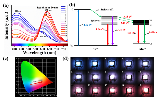 研究发现一种Sn2+/Mn2+共掺氟磷酸盐玻璃具有连续可调谐宽谱带发射的特性。更重要的是这种荧光玻璃具有高的热导率(3.25-3.7 W∕m · K)和优异的化学稳定性。通过直接贴合商业化的UV-LEDs,其发射色彩可以实现蓝色-冷白-暖白-红色的多彩连续调谐,其超宽的光谱覆盖整个可见光波长。当其作为白光荧光体时,其CIE色坐标、CRI显色指数和量子效率分别可以达到(0.33, 0.29)、84和 0.952。这种新的荧光玻璃将成为一种在固态照明领域有潜力的荧光体。