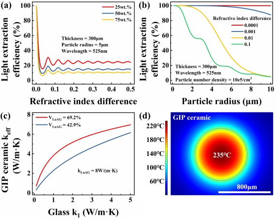 本工作提出了一种高流明效率、高热导率的GIP陶瓷荧光体。其采用折射率匹配技术,精确调控玻璃的折射率及色散,使其与荧光粉具有较高匹配度的色散曲线,从而提高了荧光陶瓷的光提取效率,实现了14.5 W/mm2功率密度下205 lm/W的绿光输出。此荧光体具有高流明效率、容易制备等优点,是一种实用性优异的激光荧光体。论文第一作者为黄色漫画 博士生张琦,该文章发表在Optics Letters。