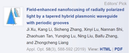 “Your manuscript entitled Field enhanced nanofocusing of radially polarized light by tapered hybrid plasmonic waveguide with periodic grooves, published in Applied Optics, has been highlighted as an Editor's Pick.