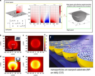 图 (a)左:理想情况下平面上折射率的变化导致的光束缚效应;右:变换得到的实际结构;(b-d)对比平面和曲面结构的电场分布;(f)实际纳米结构示意图。