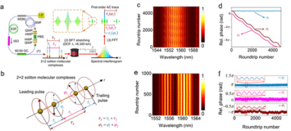 (a)、(b)实验原理图;(c)、(e)实验结果:两种不同的孤子分子动力学; (d)和(f)对应图(c)及(e)的相位演化