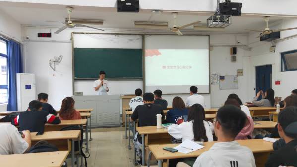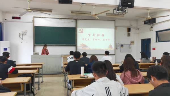 活动在国歌声中拉开序幕。首先,参会人员共同观看了“同上党史思政大课”节选视频,在赵朝峰教授的讲授下对党史有了进一步认识。接着,2019级两位学生代表张泰来、张宇轩分别进行党史学习分享,从1921年建党至2021年百年华诞,两位同学激情豪迈地向大家讲述了个人学习历程与心得体会。随后,主持人开展活动第三部分党史知识竞答,全体成员踊跃抢答,气氛高涨。