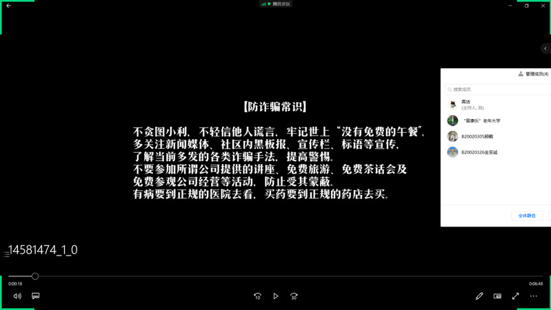活动中,学院青年志愿者协会的同学们借助腾讯会议平台,通过播放相关视频、口述真实案例等方式从老年人受骗的心理、常见的诈骗方式入手,生动形象、深入浅出地介绍了简单、实用、易懂的老年人防诈骗知识。提醒老年人生活中不要贪小便宜是远离骗子的第一关。同时也提醒老人们“远离营销讲座”“相信科学远离迷信”“前往正规机构办理业务”“不可随意发送个人信息”等。