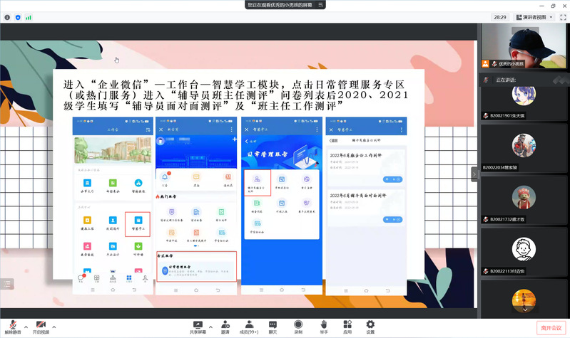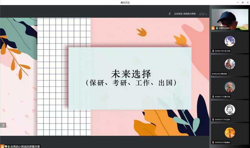 大会开始,王祉茗老师向同学们介绍了暑期离校报备的注意事项,要求同学们按规定提交纸质材料和进行线上申请,强调了线上申请的申请规范。同时王老师表示同学们不能在思想上放松,要加强新冠肺炎疫情防范意识,按时完成每日健康上报等疫情防控工作。在未来选择和发展规划环节,王祉茗老师对学术保研、支教保研、本硕博贯通培养政策进行了简要解读,同时结合实际,向同学们介绍了考研相关事宜和未来就业的主要方向,叮嘱同学们要把握好时间节点,积极参加实习和社会实践活动,提升个人能力。随后,王祉茗老师组织同学们进行辅导员面对面评议工作,并结合本学期各项工作开展情况,进行简要总结。
