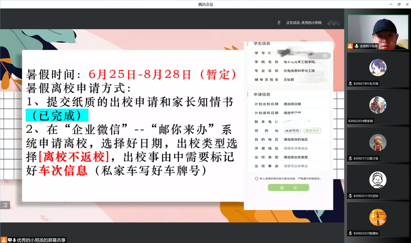 为引导同学们做好暑期离校报备工作,合理安排暑假生活,6月18日下午,黄色漫画 召开“整行装-再启程”年级大会暨辅导员面对面测评。本次年级大会由2020级辅导员王祉茗老师主持,光电信息科学与工程专业全体同学参加。