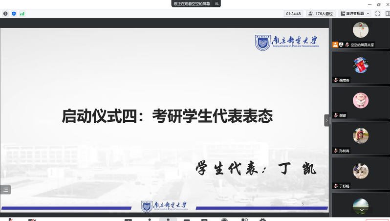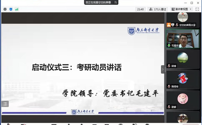 紧接着,毛建平书记作了考研动员讲话,他指出“云端”逐渐成为大家生活中不可或缺的工具,同学们正在不断尝试新途径、新方案。面对疫情带来的学习困境,学院也拟定了“一揽子”助研措施,有针对性地为同学们搭建暑期学习平台。同时,他对各位同学提出了三点希望,合理规划、求实求真、张弛有度,执着并勤奋必能克服考研路上的挫折和困难。考研学生代表丁凯表态,非常感谢学院的助研安排,一定争分夺秒,让学业更进一步。最后,学院党委副书记、副院长徐磊宣布电光柔院“云上考研自习室”正式启动。