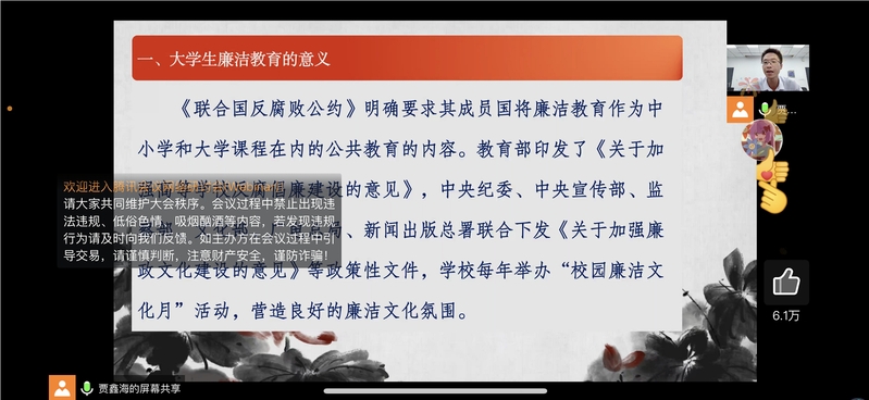 9月14日下午,黄色漫画 党委委员、专职纪检委员宋健康老师对2022级新生开展了廉政教育与校园廉洁文化线上教育讲座。以“心中的道德定律,廉洁与青春同行”为主题,从何为廉洁、何为腐败、廉洁的意义、党的反腐廉政建设、校园廉洁建设等方面开展专题讲解。