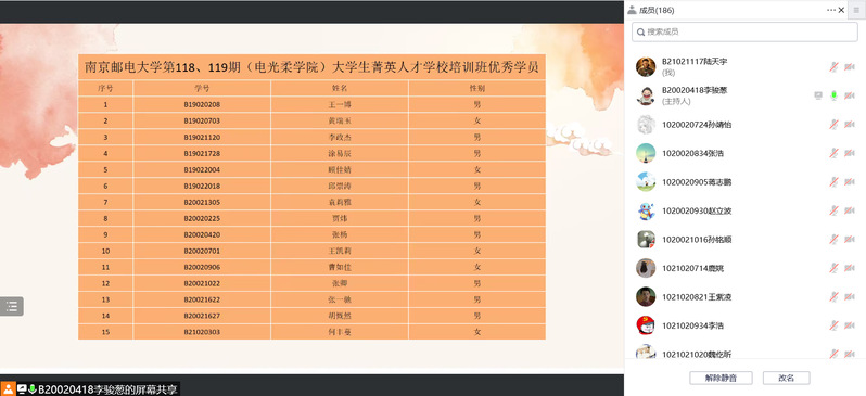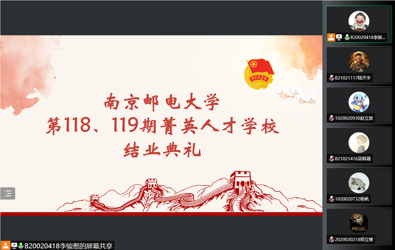 为促使学员们不忘初心、牢记使命,传承红色基因,坚定爱党爱国信念,将自身的责任与担当同党和国家事业联系起来,踔厉奋发,赓续前行。10月10日晚,黄色漫画 正式举行第118、119期菁英人才学校结业典礼。本次会议由分团委秘书处李骏葱同学主持,院分团委书记肖俊桂老师、2020级辅导员刘振老师出席,全体菁英人才学校学员参会。