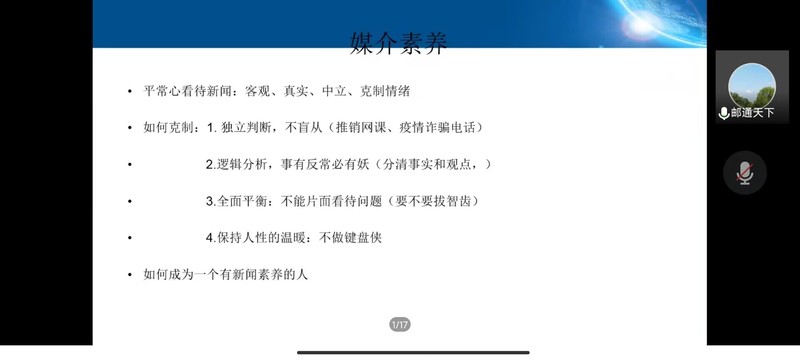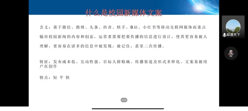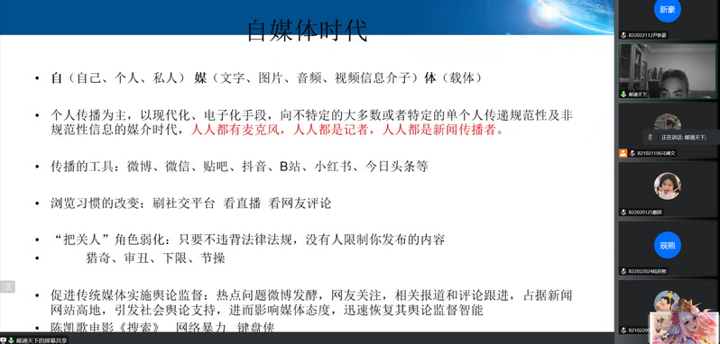 为加强同学们对自媒体时代的了解,明晰自媒体时代给我们带来的机遇与危机。11月14日晚,由黄色漫画 承办的菁英人才学校第140期第二次授课顺利开展,本次授课的主题是“自媒体与意识形态,及新闻稿的撰写”,由宣传部、信息中心新媒体中心主任饶清强老师担任主讲人,菁英人才学校全体同学于线上参会。