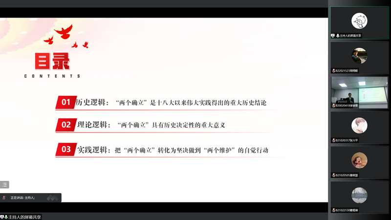 会议开始,电光柔院分团委书记肖俊桂老师介绍了本次会议的主要内容。随后,沈召前教授对党的二十大报告展开了深入讲解与剖析,介绍了党的二十大最重要的政治成果。沈教授认为,要保证这些政治成果和行动指南,最重要的是全党、全军、全国各族人民深刻把握“两个确立”,坚决做到“两个维护”。沈教授强调,“两个确立”是深刻总结党的百年奋斗历史经验、深刻总结党的十八大以来伟大实践得出的重大历史结论,是推进中华民族伟大复兴历史进程最根本的保证。把“两个确立”转化为坚决做到“两个维护”的自觉行动,要求我们思想上高度认同,政治上坚决忠诚。只有把“两个维护”作为党的政治建设的首要任务,才能形成万众一心的磅礴力量,才能应对国内外各种风险和考验,不断夺取中国特色社会主义事业新胜利。