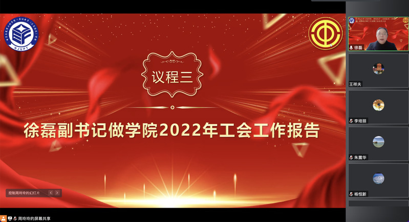 学院分工会临时负责人、院党委副书记徐磊作了学院2022年工会工作报告,并表示,学院分工会将要以党的二十大精神为指导,始终坚守政治方向、维护发展大局,持续强化组织本领、提升工作成效;将始终把“为教师服务、促学院发展”的双赢理念作为分工会工作重心,关心教师利益、维护教师合法权益,做好教师服务保障,为实现全体教职工的健康、平安、幸福与美好发展愿景,为实现学院高水平、可持续发展而不懈奋斗。