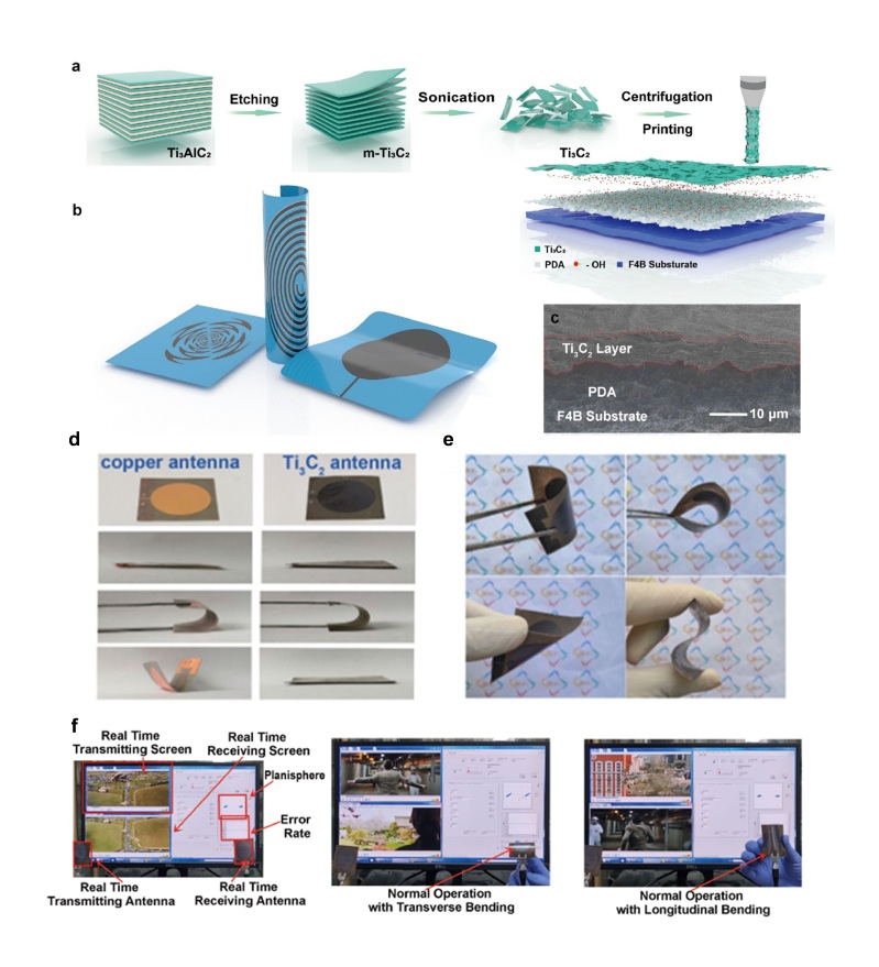 得益于良好的亲水性、易于调整的流变范围、可在多种溶剂中形成稳定分散体等特性,Ti3C2墨水可作为印刷与图案化制造领域的常用材料。二维Ti3C2超薄纳米材料具有高电导率、轻质柔性、易加工等优点,非常符合柔性无线通信器件的制备和使用要求,开始在该领域崭露头角。但目前关于Ti3C2天线的研究成果存在结构受限、组成复杂、生产工艺粗糙等缺陷,很大程度上限制了其在柔性无线通信器件方向的应用。因此,简化天线层级结构、提高器件制备精度、提升天线柔性和稳定性等成为Ti3C2柔性射频电路实用道路上亟待解决的关键核心问题。