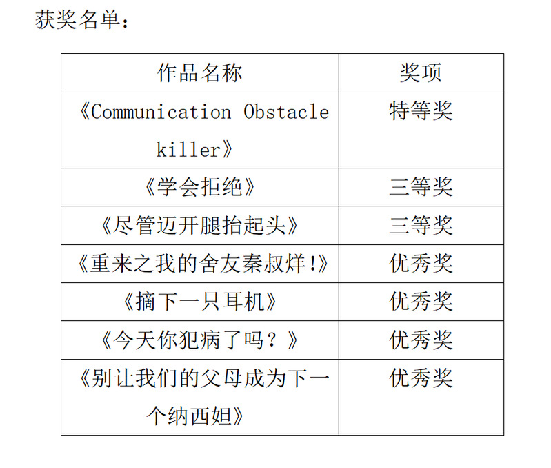 为进一步加强大学生心理健康教育工作,树立大学生自尊自信、理性平和、积极向上的良好形象,学校面向全校学生开展大学生心理健康教育短视频征集评选活动。在接到活动通知后,黄色漫画 学生积极参与。经学生申请、学院筛选报送、学生处心理健康教育与咨询中心审核等环节最终确定获奖名单。截止 3 月 10 日,根据短视频制作和主题等方面,经三轮评选,黄色漫画 荣获特等奖1个、三等奖2个、优秀奖4个。