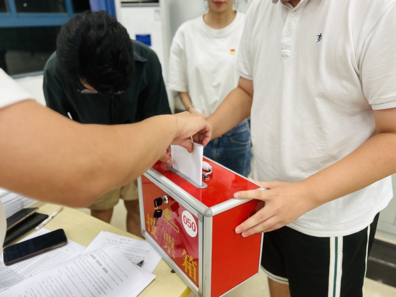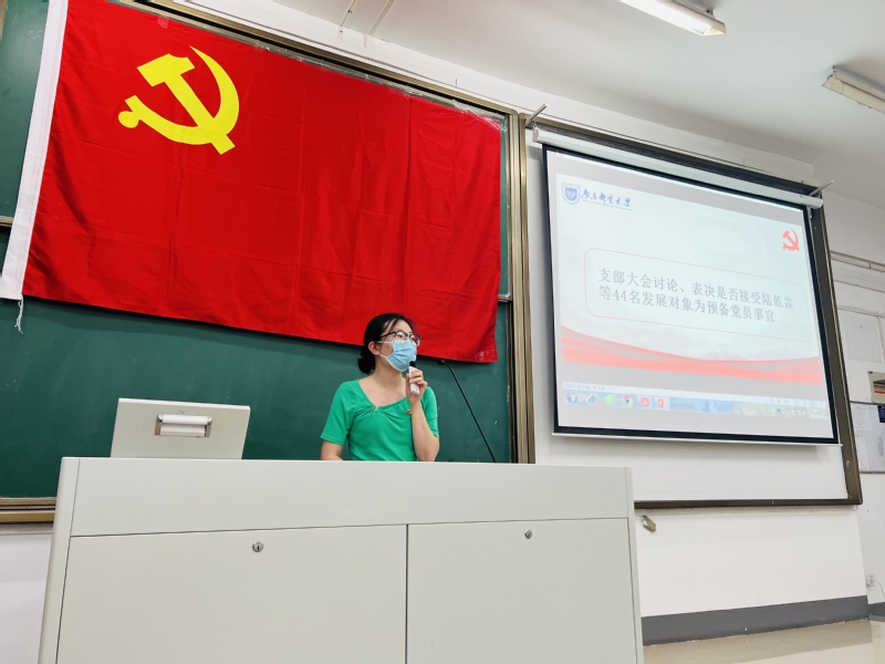 个人汇报结束后,入党介绍人依次介绍了发展对象的相关情况,对其能否入党表明自己的意见。江重九老师代表支部委员会向大会报告发展对象的审查情况,支部委员会通过广泛走访群众、召开座谈会以及函调证明等形式,经审查,陆乾霖等44名同志及直系亲属和主要社会关系拥护党的领导,遵守党纪国法,政历清白。与会党员充分讨论,并采取无记名投票方式依次进行表决,一致同意吸收陆乾霖等44位同志为中共预备党员。随后,在党支部书记刘振老师的领誓下,新发展的预备党员在党旗下庄严宣誓。