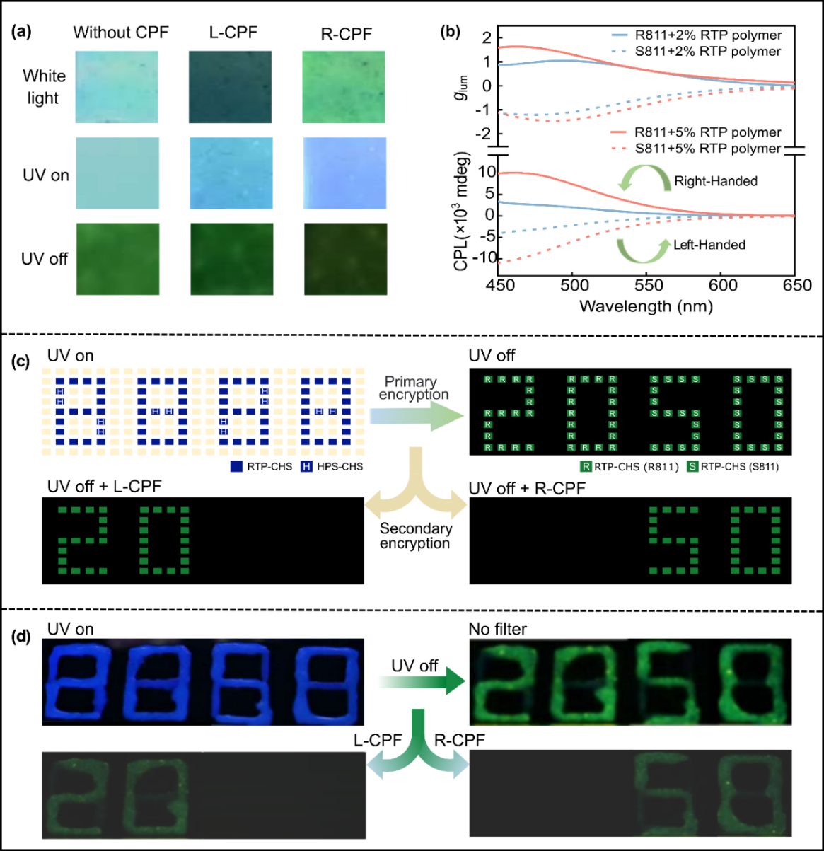 该研究将具有长寿命和高不对称因子的RTP与光学多路复用相结合,设计了一种信息加密装置(图2a-c)。该装置主要为含有右手手性剂R811和左手手性剂和S811的RTP-CHS薄膜(图2d)。薄膜在紫外光照射下具有相似的发射颜色,装置显示出蓝色的数字“8”、“8”、“8”和“8”。当紫外光源关闭时,由于RTP共聚物的持久磷光特性,只有绿色的数字“2”、“0”、“5”和“0”变得可见,这构成了信息加密的第一层。当关掉紫外灯光源并引入左旋圆偏振片时,只有含有R811的数字“2”和“0”变得可见,并呈现浅绿色,与图2b中的正圆偏振光(实线)相匹配;而将左旋圆偏振片替换成右旋圆偏振片时,只有含有S811的数字“5”和“0”能够被识别出来,与图2b中的负圆偏振光(虚线)相对应,从而构建了二级加密。这一研究将为光学多路复用、防伪和信息加密等领域带来潜在的应用。该成果为圆偏振有机超长室温磷光材料的开发和利用拓展了新思路,并有望在防伪和信息加密等领域取得突破性进展。