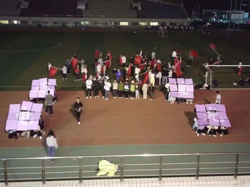 在白天,天气千变万化,时而炎阳炙人,时而阴云风起,方阵成员挥洒晶莹的汗水,忍受躁动的凉风,听从老师的指挥,站在属于自己的位点,练习走位以及表演动作;夜幕下,借着主席台下的灯光,艳丽的旗帜和牌板、孜孜不倦的身影,鲜活了整个操场,生气勃勃。