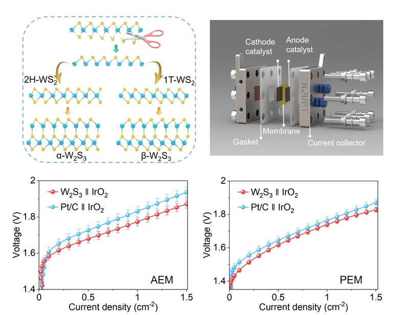 二维过渡金属硫化物(TMDs)已成为析氢反应中具有很好应用前景的催化剂,在可再生能源技术中发挥着至关重要的作用。打破二维TMDs固有的结构范式限制是探索其迷人的物理和化学特性的关键,有望开发出革命性的析氢催化剂。有鉴于此,赵强教授研究团队创新性地通过独特的化学计量生长策略成功制备出具有金属性的W2S3结构。研究结果表明,得益于四配位结构优异的导电性和亲水性,以及适当的吉布斯自由能值和足够低的水解离能垒,W2S3作为催化剂在酸性和碱性电解质中都表现出接近商业Pt/C的析氢活性和较高的长期稳定性。在质子交换膜(PEM)和阴离子交换膜(AEM)电解槽中应用时,作为阴极催化剂的W2S3可获得极佳的双功能指数(η@1 A cm-2, PEM = 1.73 V, η@1 A cm-2, AEM = 1.77 V)和长期稳定性(471 h@PEM,衰减率为85.7 μV h-1,360 h@AEM,衰减率为27.1 μV h-1)。该工作进一步丰富了探索硫化钨非凡物理特性的结构空间,为未来开发可持续制氢的先进电催化剂提供了一条前景广阔的可行途径。