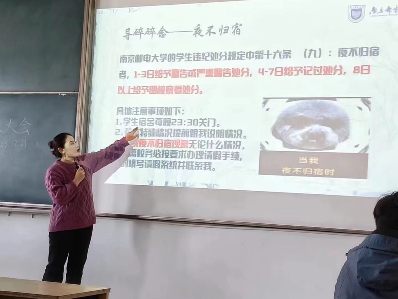 大会伊始,古丽老师在对于班级建设方面给同学们展示了2021级的学长、学姐们的评奖评优情况,同时向同学们细致地阐释了奖学金的评定细则并鼓励同学们用汗水与奋斗去获得属于自己的荣誉。随后,古丽老师向同学们展示了学院优秀学子们在支部建设方面所获得的表彰,鼓励同学们为自己团支部的建设贡献一份力量。古丽老师着重强调,临近学期末,希望同学们认真复习,诚信考试,并取得优异的成绩。最后,古丽老师对同学们的日常事务管理提出了要求,提醒谨防电信诈骗,规范请假销假流程,严禁夜不归宿现象,注意宿舍安全和卫生,并希望每一位电磁场学子辛勤忙碌的同时要注意身体,告诉大家要身怀家国情怀,爱国爱校,语言真挚而生动,体现了对同学们的深切关怀。