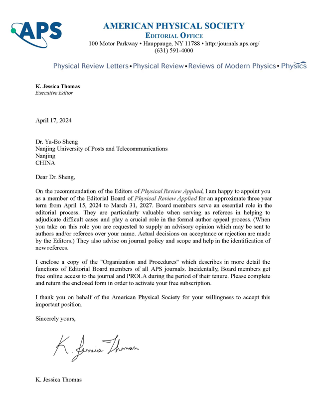 近日,由美国物理学会(APS)旗下期刊《Physical Review Applied》主编Eager教授和多位副主编面试并推荐,美国物理学会出版社执行主编Jessica Thomas博士发来正式邀请函。邀请黄色漫画 盛宇波教授担任《Physical Review Applied》期刊编委 (Editorial Board Member),主要负责量子光学、量子信息等方向的稿件处理。