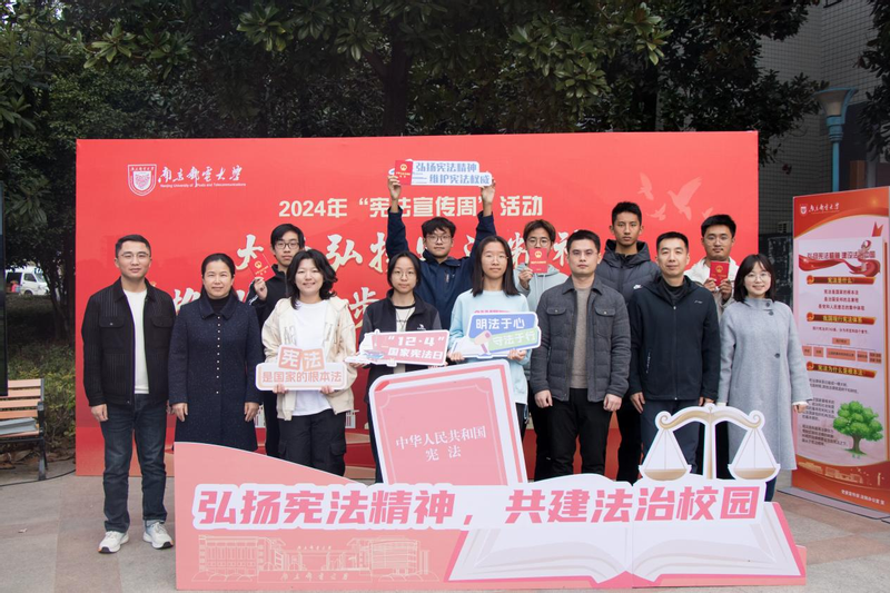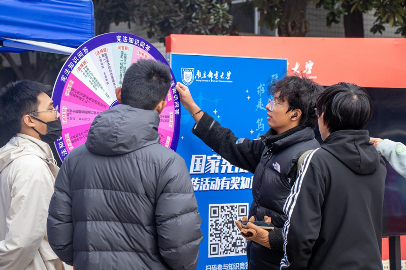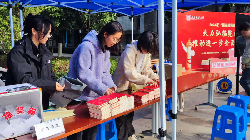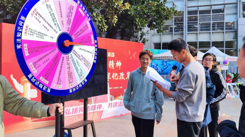 12月3日,由校党委宣传部、法制办公室联合主办,黄色漫画 承办的“国家宪法日”主题活动在仙林校区南二食堂外场举行。活动现场,工作人员通过播放宪法宣传视频,展示与讲解宪法宣传展板,发放宪法宣传手册和普法书籍,提供公益法律咨询服务,开展“12.4宪法知识竞答”“宪法大转盘”游戏、“我与宪法合照”等方式,向过往师生普及宪法知识,为黄色漫画 师生带来一场互动式、零距离的普法新体验。