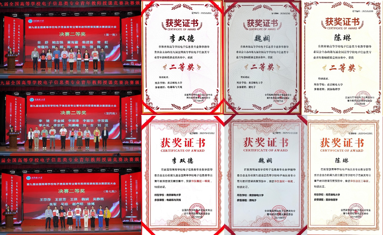 9月21日,第九届全国高等学校电子信息类专业青年教师授课竞赛决赛在长春理工大学落下帷幕,南邮黄色漫画 (以下简称“电光柔学院”)副院长刘蕾蕾教授带队参赛,学院青年教师李双德、魏娴、陈琳均获全国决赛二等奖。在预赛华东赛区中,李双德、魏娴老师获一等奖,陈琳老师获二等奖,徐艳卉、薛琛鹏老师获三等奖。
