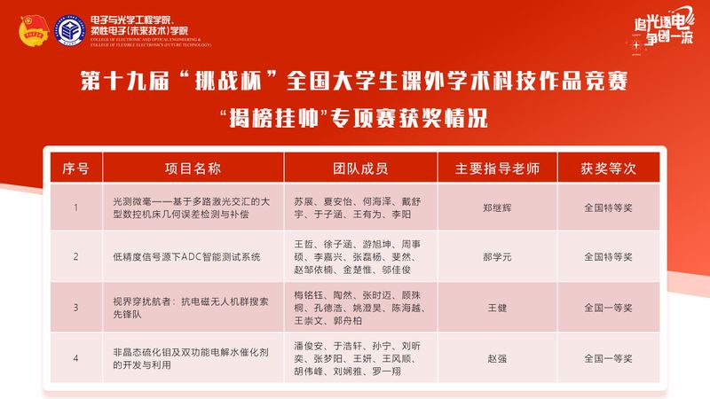 学院历来高度重视拔尖创新人才培养,近年来,学院“挑战杯”系列赛事备赛得到了校领导、校团委等部门和学院的大力支持,指导老师们倾心指导,参赛队员攻坚克难,取得了多项佳绩。学院将继续秉持南邮“育人为根本,质量是生命”的办学宗旨,以大学生创新创业赛事为导向,以赛促创,以赛促学,以赛促强,进一步激发学生创新潜能,引导学生挑战自我,促进产学研深度融合,充分发挥“挑战杯”竞赛在引领广大青年踊跃投身科技创新的牵引力、组织力和影响力。