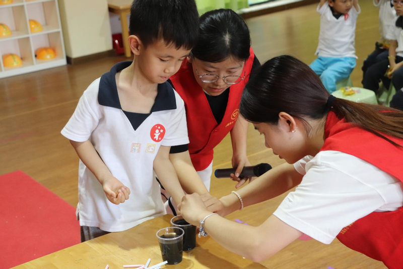 在虹吸实验区域,孩子们纷纷与志愿者合作,用一根小吸管、两只水杯来实现虹吸现象,随着水流顺利从志愿者手中的杯子倒入小朋友手中的杯子,孩子们发出一阵惊呼,感受到了虹吸现象的魅力。