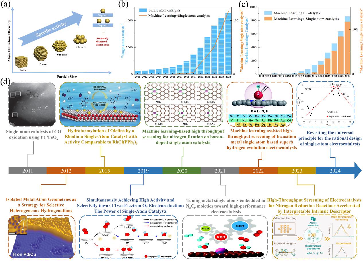 本论文聚焦机器学习在SACs发现、开发与合理设计中的最新研究进展。第一部分总结并分析了机器学习应用于SACs研究的最新趋势。在第二部分中,主要介绍了SACs中ML的系统工作流程。在第三部分中,介绍了关键催化反应中SACs的ML应用,包括CORR/CO2RR、HER、NRR和ORR/OER。第四部分探讨了机器学习应用在SACs发现和设计中的关键挑战和未来方向。